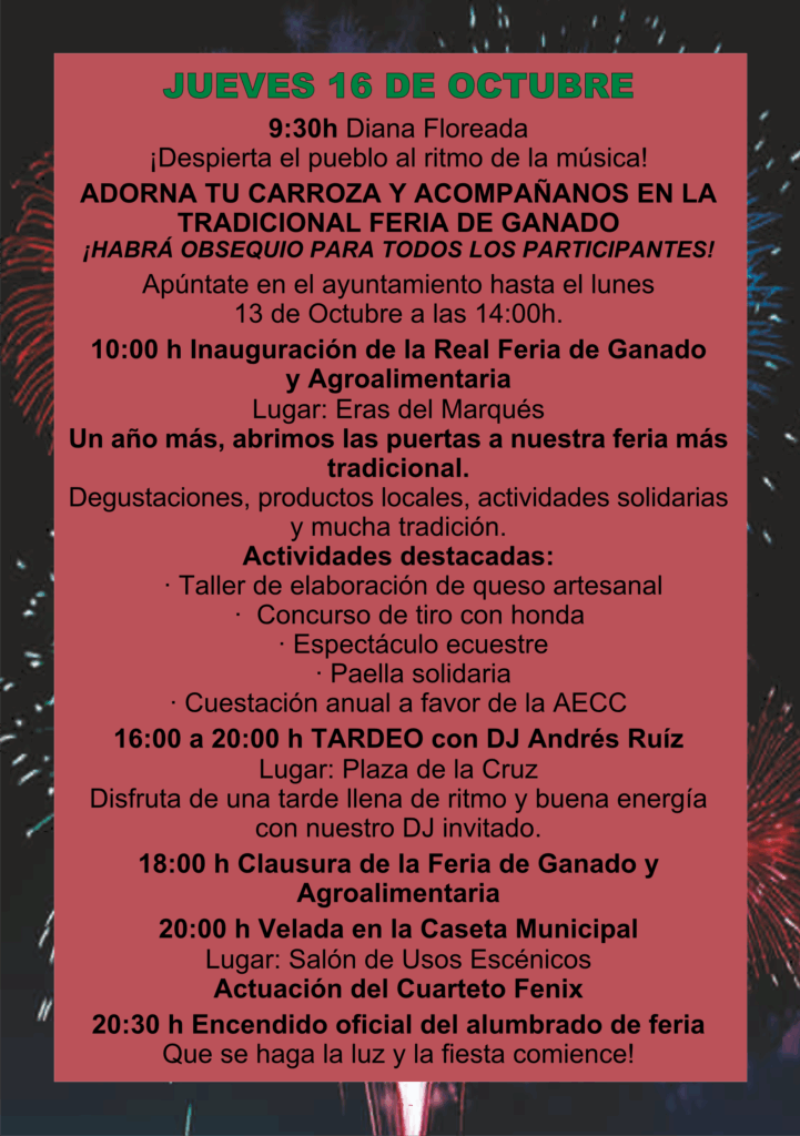 Los visitantes podrán disfrutar de exhibiciones ecuestres, mercados de artesanía y productos agroalimentarios, actuaciones musicales, cucañas y una gran paella solidaria que ya se ha convertido en tradición. Todo ello dentro de un ambiente acogedor y familiar que convierte a esta feria en una cita imperdible.